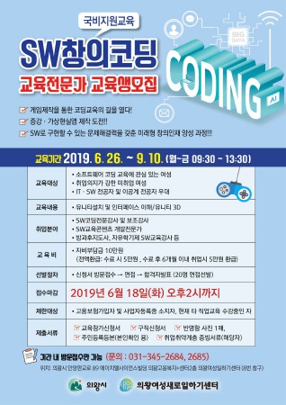 경기 의왕시 여성새로일하기센터(이하 새일센터)는 소프트웨어 코딩교육에 관심 있는 여성들의 취업 지원을 위한 'SW 창의코딩 교육전문가 과정'에 참여할 교육생을 모집한다.