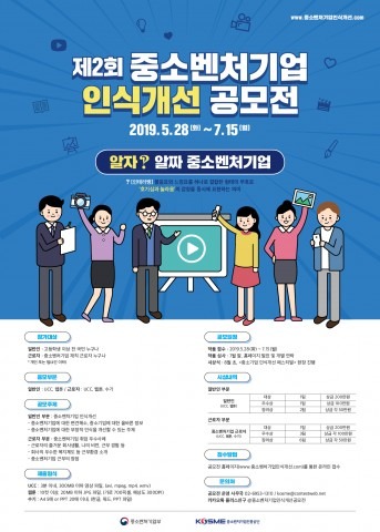 중소벤처기업부와 중소벤처기업진흥공단(이하 중진공)은 중소벤처기업 긍정적 인식 확산 및 위상 제고에 힘쓰기 위해 5월 28일부터 ‘제2회 중소벤처기업 인식개선 공모전’을 개최한다고 밝혔다.